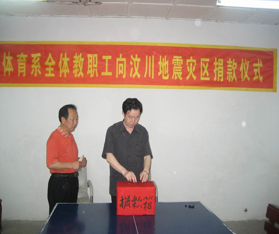 5月15日晚,体育系全体教职员工齐聚一堂,向灾区人民进行了集体募捐仪式。系党总支书记高家久同志宣读了学校工会的倡议,并带头捐款,广大教师积极响应,短短15分钟,就募集捐款近六千元。