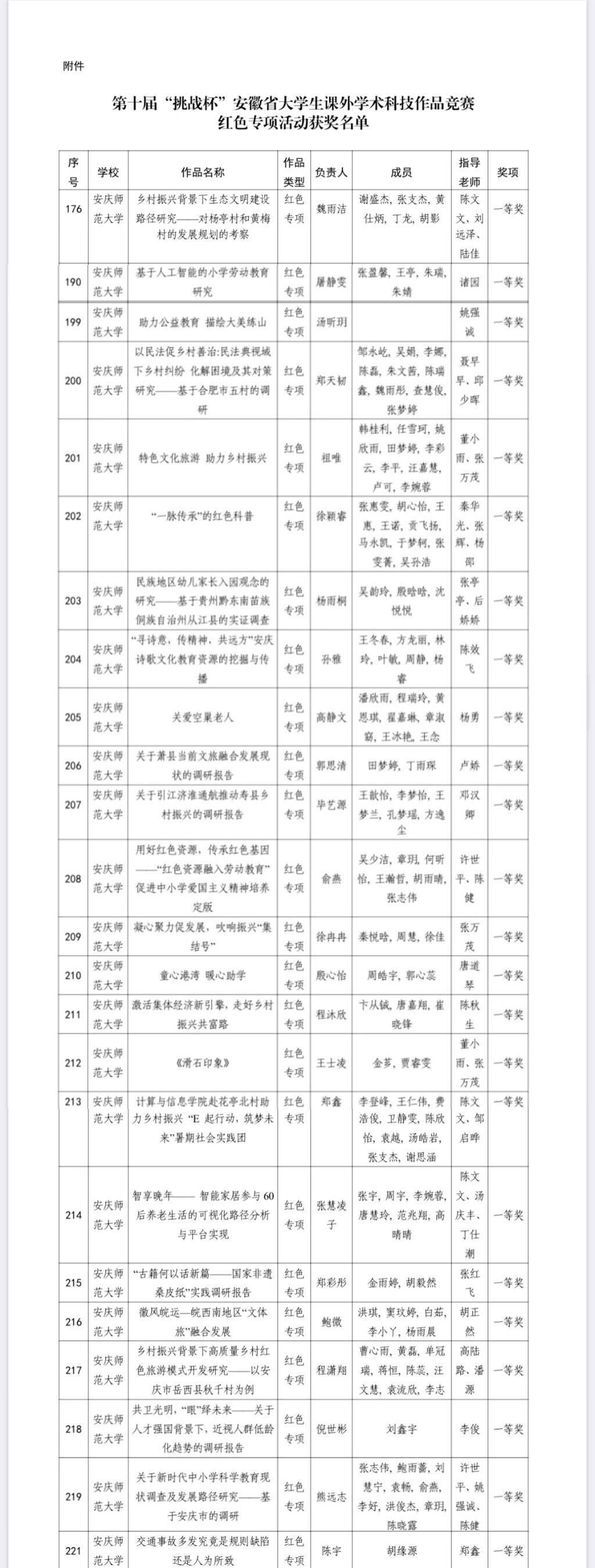 近日,第十届“挑战杯”安徽省大学生课外学术科技作品竞赛红色专项赛获奖名单公布,beat365官网共105项作品获奖,其中《乡村振兴背景下生态文明建设路径研究——对杨亭村和黄梅村的发展规划的考察》《基于人工智能的小学劳动教育研究》《助力公益教育 描绘大美练山》《以民法促乡村善治:民法典视域下乡村纠纷 化解困境及其对策研究——基于合肥五村的调研》《特色文化旅游 助力乡村振兴》等24项作品获一等奖,36项作品获二等奖,45项作品获三等奖,一等奖获奖成绩和获奖总成绩均位居全省高校第二。