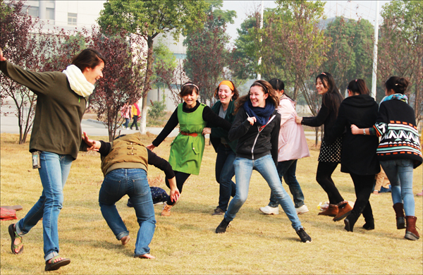 为了配合美国交流生完成他们的旅行学习,11月11日文学院选派了15名对外汉语专业的学生,对交流生们每天进行两个小时的 “一对一”辅导。教学的内容和方式,均由外汉专业的学生自己设计。“我是采取ppt展示的方式,向他介绍一些关于中国节日和中国传统习俗的小常识,一些生动有趣的图片更能增加他对上课内容的理解。”汉语国际教育专业13(2)班的刘滢说。而来自大三的王新慧则是选择立足于美国交流生的汉语教材,教他们一些打招呼、问路等比较实用的日常交流用语。“一对一”辅导之后,交流生们被分到不同班级,与beat365官网学生进行一小时的课堂交流学习。
