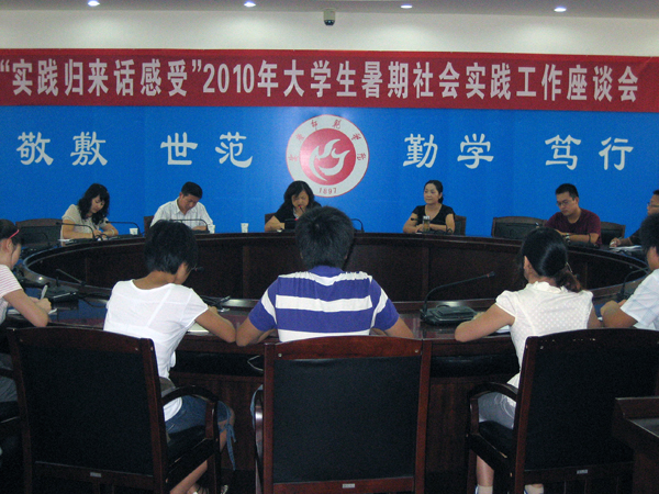 为认真探索大学生社会实践的规律,提升暑期社会实践对大学生的教育效果,促进社会实践工作的可持续发展,9月8日下午,“实践归来话感受”学生暑期社会实践工作座谈会在行政楼二楼会议室召开。校创先争优办公室、宣传部、学工部和团委等部门负责同志与50多名学生代表一起参加了座谈会。