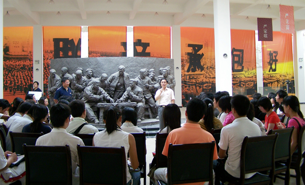 这次实践教学活动以“实岗”为形式,以“改革开放是决定当代中国命运的关键抉择”为内容,由邵军老师组织。教学活动分三个阶段进行。第一阶段,主要由大包干带头人、原小岗生产队队长严俊昌向全体学生介绍了当年决心进行大包干的原因和经过,介绍了小岗村改革开放三十年来发生的巨大变化、未来发展设想和发展中存在的问题。第二阶段,学生分成四个小组按照各自设计的调研方案,深入小岗村大学生创业园等地进行调研;第三阶段,在凤阳大包干纪念馆内,各小组集中汇报了各自的调研情况和“实岗”方案,畅谈自己如果在小岗村的某一岗位上将如何工作、为小岗村的发展做贡献的设想。这次教学将理论学习和社会实践、分散调研与集中教学、实地参观与岗位模拟、教师讲授与师生研讨、真实情景与教学内容相结合,进一步提高了教学效果,更好地实现了教学目的,受到了学生的热烈欢迎。