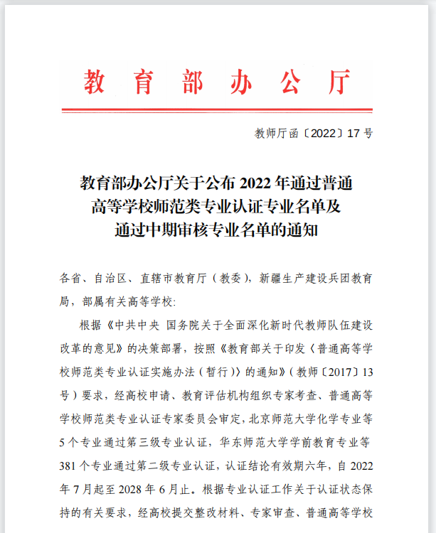 近日,教育部办公厅公布了2022年通过普通高等学校师范类专业认证专业名单,beat365官网汉语言文学、数学与应用数学、物理学和生物科学4个专业顺利通过师范类专业中学教育第二级认证。目前,beat365官网共有7个师范专业通过教育部师范类专业第二级认证。