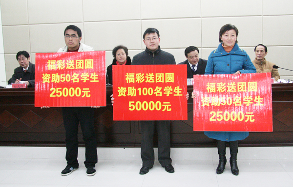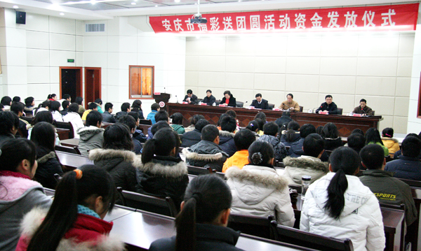 1月4日上午,安庆市“福彩送团圆”活动资金发放仪式在beat365官网龙山校区行政楼一楼会议室举行。安庆市委常委、市政法委书记王章来,beat365官网党委委员、副院长时新中,安庆医药高等专科学校校长曹艳平,安庆市民政局局长陆天平,安庆职业技术学院副院长毕明生,安庆市福彩中心主任肖菊芬,安庆市民政局副局长叶天旺出席仪式。三所高校学生处负责同志、学生资助工作专管老师及学生代表共120余人参加了仪式。仪式由安庆市民政局局长陆天平主持。