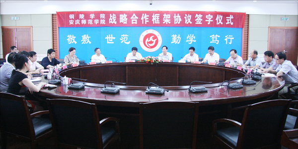 何小祥同志代表学院对铜陵学院领导一行的到来表示热烈欢迎。他指出,铜陵学院与安庆师范学院各自具有鲜明的办学特色和发展优势,长期以来始终保持着密切的交流合作关系,共同为我省高等教育发展做出了积极贡献。在新的历史时期,两校紧密携手,签订战略合作框架协议,既是贯彻落实《国家中长期教育改革和发展规划纲要》、《高等学校创新能力提升计划》和省委关于高教强省建设的意见的重要举措,也是两校合作共建、深化教育教学改革的切实需要。他希望,在今后的发展中,两校本着“优势互补、资源共享、相互协作、共同发展”的原则,充分发挥各自优势,深化合作,加强交流,积极探索创新型人才培养模式和多渠道、多层次、多形式的协同创新模式,努力提升双方的人才培养与科学研究水平,为更好地服务区域经济社会发展做出新的更大的贡献。
