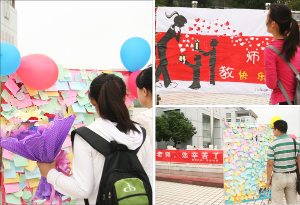 “老师,祝您身体健康,工作顺心。”“老师,谢谢您对我的教育。”“老师,您要注意休息。”……在敬敷广场上竖立的三块展板上,不计其数的便利贴上写满了同学们对老师的祝福。
