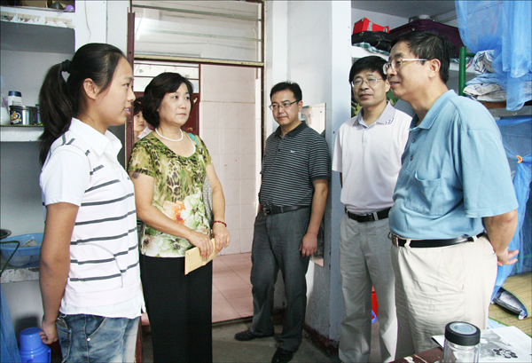 当天上午8点30分,离约好的时间9点还有不短的时间,何小祥书记就来到了化学化工学院办公室,准备在学生处、化学化工学院等部门负责同志的陪同下,前去看望孤儿大学生袁淮。因为何书记最近腿上旧伤发作,腿上还贴着膏药,上下楼不太方便。学生处和化学化工学院的领导都建议何书记,就在办公室见一下学生,不要去爬六楼了。但是何书记却说,“不,我们一定要去看看她,看看她还有什么困难!”。