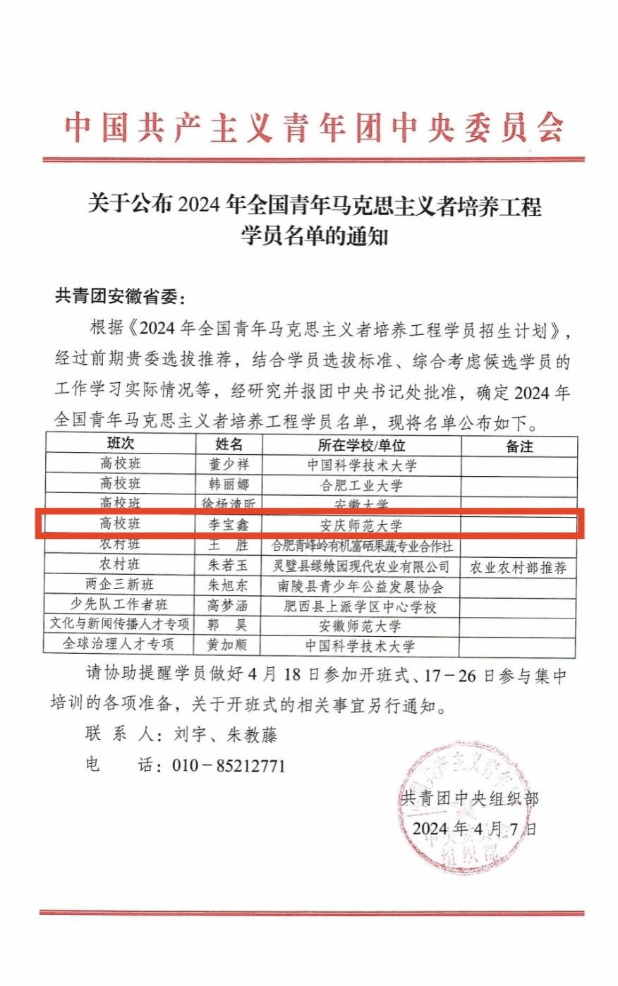 近日,共青团中央组织部公布《2024年全国青年马克思主义者培养工程学员招生计划》,全省仅4名高校学生入选。