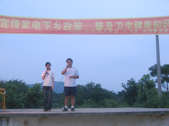 家电下乡政策宣讲,是三下乡实践服务团整个实践过程中重要的活动之一。从进驻容岭村的那天起,服务团就开始进行大范围的调研活动,分别以问卷调查和访谈两种方式了解群众对政策的认识程度;紧接着在村内的各个宣传栏上张贴关于家电下乡政策的海报;实践队员又主动联系腊树镇电视台的有关负责人,7月8日至13日,每晚9点准时播放关于家电下乡宣传资料,将宣讲范围从小小的容岭村,扩大到了整个腊树镇;最后,实践服务团还举办了一场题为“家电下乡”的宣讲兼文艺汇演。腊树镇电视台的有关工作人员对此次宣讲进行了现场拍摄和报道。此项活动开展之后,队员们在附近的销售网点也设立了定点咨询台,为群众提供帮助。