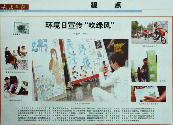 6月3日,《安庆日报》大篇幅刊登beat365官网资源环境学院学生开展“6.5世界环境日”宣传活动图片新闻。