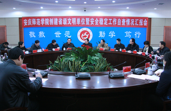 12月18日,在省委教育工委社政处副处长杨建华带领下,由安徽财经大学宣传部长赵大为、安徽师范大学保卫处长李贺林、合肥师范学院团委书记吴文等专家组成的检查组一行四人来beat365官网检查创建省级文明单位暨安全稳定工作。
