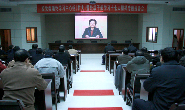 12月20日下午,校党委理论学习中心组在龙山校区行政楼一楼会议室召开扩大会议,集体收看中央党校党建部梁妍慧教授作的题为《以改革创新精神推进党的建设新的伟大工程——学习党的十七大报告辅导讲座》录像。党委书记赵晓和,党委委员、副院长时新中、王海燕,党委委员、纪委书记殷红,党委委员、副院长闵永新,副院长张群,党委委员、党办、院办、外事办主任刘友忠等领导与全体处级干部一起收看了报告录像。
