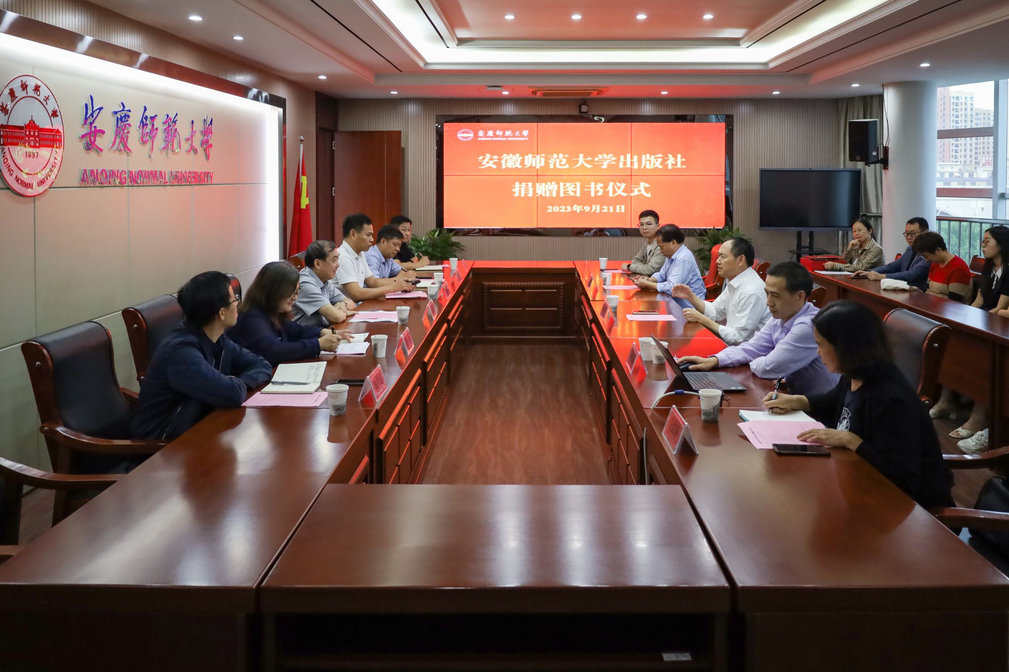 9月21日,学校举行安徽师范大学出版社捐赠图书仪式。校长彭凤莲会见安徽师范大学出版社社长张奇才、总编辑戴兆国一行。校党委常委、副校长刘友忠出席捐赠仪式,教务处、图书馆负责人及教职工代表参加仪式。