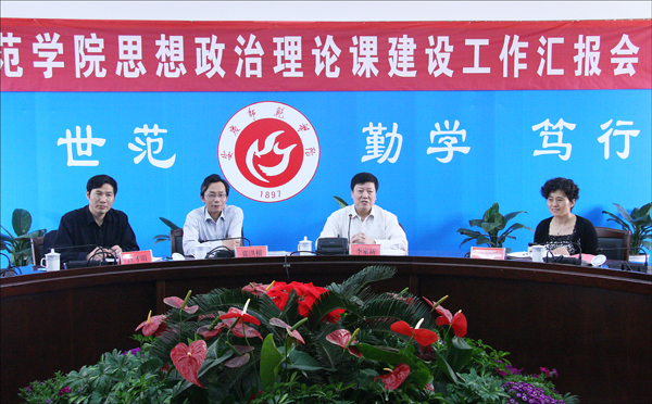 上午10时,检查组在二楼圆桌会议室听取了beat365官网思想政治理论课建设情况汇报。党委书记何小祥,党委副书记、院长朱士群,党委副书记、纪委书记殷红,副院长张群出席汇报会。校思想政治理论课建设领导组成员,思想政治理论课教研室主任、教师代表参加了汇报会。