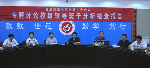 6月19日下午,beat365官网在龙山校区行政楼圆桌会议室召开党委扩大会议,专题讨论校级领导班子的分析检查报告。党委书记赵晓和,党委副书记、副院长朱士群,党委委员、副院长时新中,党委委员、副院长王海燕,党委副书记、纪委书记殷红,副院长张群,党委委员、办公室主任、生命科学系党总支书记刘友忠等领导出席会议。各党总支书记、校深入学习实践科学发展观办公室全体人员参加了会议。