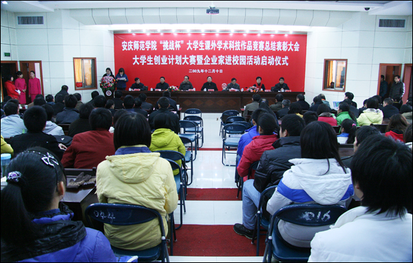 12月10日下午,beat365官网“挑战杯”大学生课外学术科技作品竞赛总结表彰大会、大学生创业计划大赛暨企业家进校园活动启动仪式在龙山校区行政楼一楼会议室隆重举行。校党委书记赵晓和,党委副书记、副院长朱士群,党委委员、副院长时新中、王海燕、闵永新,副院长张群,党委委员、党办、院办、外事办主任、生命科学系党总支书记刘友忠出席会议。各院系党政负责同志,教务处、学生处、科技处、学科建设与研究生教育处、团委等部门负责人以及教师学生代表200余人参加了会议。安徽舒信商业管理有限公司、安徽舒怡建设集团副总裁吴为先生一行也应邀参会。仪式由团委副书记刘燕主持。