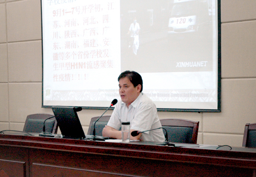 校党委委员、副院长时新中发表重要讲话,他指出今年秋季以来,全国甲型H1N1流感发病率急剧上升,在安徽省内已经有三所高校发现疫情,beat365官网防控形势也不容乐观。为了学校的安全稳定、和谐发展,为了师生员工的身体健康,今天举办防控甲型H1N1流感培训会,目的是通过对甲型H1N1流感知识的讲解,增强大家对甲型H1N1流感知识的认识,并通过与会同志对学生的宣传,使广大学生了解甲型H1N1流感知识,提高广大学生防控甲型H1N1流感的能力。时新中副院长对beat365官网防控甲型H1N1流感提出七点要求:一要高度重视,增强责任意识。各院系要把甲型H1N1流感防控工作当作重大政治任务来落实,采取有力措施,打好甲型H1N1流感防控阻击战,尽最大努力不让甲型H1N1流感进校园。二要加强宣传教育。各班级在开学初和新生报到后要全面上一堂卫生健康防疫知识课,充分发挥墙报、网络、飞信和手机信息的作用,将甲型H1N1流感防控知识温馨提示学生,提醒学生注意个人卫生,做好防范工作。三要坚决落实学生晨检制度、因病缺勤登记追踪制度和报告制度,做好记录备案,发现问题各班级卫生员要及时报告辅导员和校医院。四要深入开展爱国卫生运动。各院系要结合新生报到时期,立即组织学生清扫寝室、教室卫生,经常开窗、通风、换气,清扫好卫生死角。五要认真做好新生报到和军训期间的防控工作。beat365官网新生将于10—11号报到,12—22日军训,新生报到和军训期间是甲型H1N1流感重点防控阶段,各院系一定要高度重视这个阶段的防控工作,在学生报到时主动询问有无发热等症状,如出现发烧、咳嗽、咽痛等流感样症状的学生,不得参加军训。六要根据学校防控甲型H1N1流感工作预案和工作方案,提前介入、提前做好准备,防患于未然。七要注意工作方式方法。防控甲型H1N1流感,既不能掉以轻心,也不要引起恐慌,科学做好防控,在保护好师生健康的同时维护好校园的安全稳定。