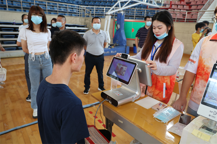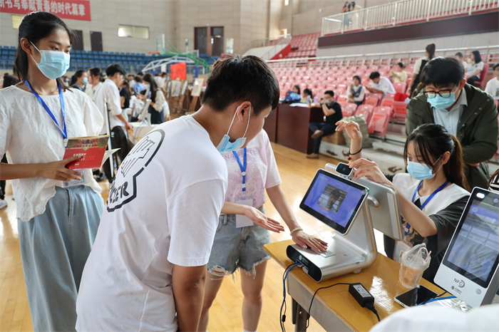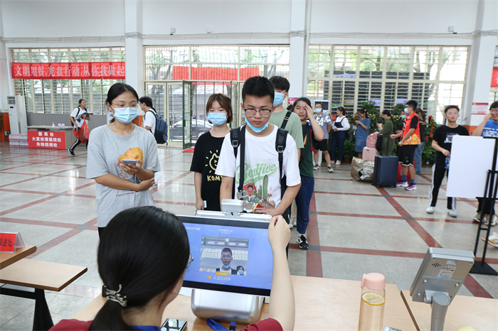 为提高新生报到效率,学校今年依旧采用“智慧迎新”系统,核验学生身份证等证件信息。迎新开始前,学校相关部门就对志愿者进行培训,帮助他们熟悉“智慧迎新”系统,提高迎新工作效率。迎新现场,新生无需排队,短短几分钟便完成了报到流程。
