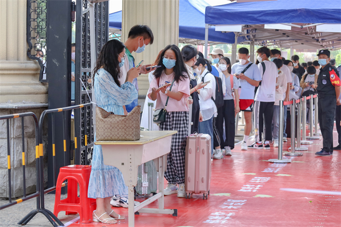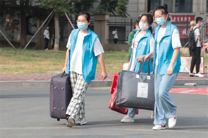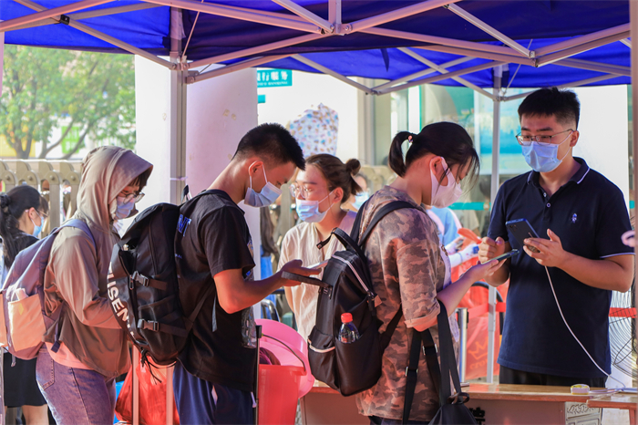 校园内,在各院系报到点、宿舍楼前都能看到许多朝气蓬勃的新面孔,新生在志愿者的指引下依次完成“安康码”“行程卡”“今日校园APP身份”查验、入校核酸检测等流程,并有序完成报到工作,领取军训物资,入住宿舍。迎新当日,全校志愿者在新生八点入校前全部到达指定岗位,各司其职,或引导新生完成报到流程,或帮助新生来回搬运行李。志愿者之一、体育教育专业2021(3)班的徐启星一上午都在烈日下帮新生搬运行李、介绍学校概况,连口水都没来得及喝,他说:“去年我入学时手臂脱臼,全程就靠学长学姐帮忙,今年我也要传递这种温暖。”面对志愿者的热情,不少新生连声道谢,还与志愿者分享家乡特产。