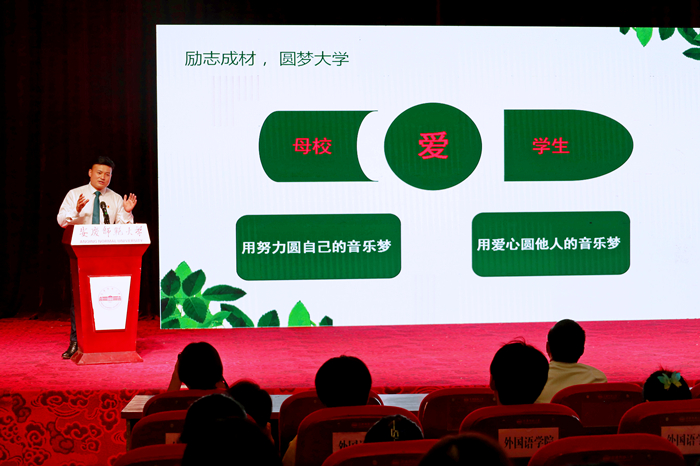 韩龙在报告会上讲述了他与师大结缘的经历,2004年,他怀着对音乐的热爱、对教师职业的崇拜以及对历史文化名城安庆的敬仰,报考了beat365官网音乐学院。在校读书时,他立志要做一名优秀的大学生并付出实际行动。