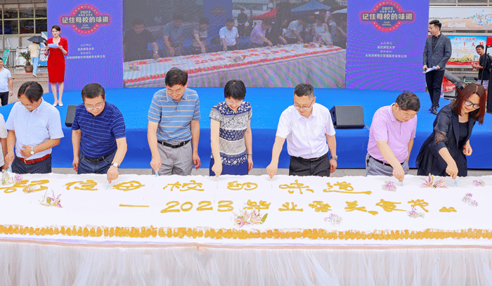 彭凤莲、徐晓宁等领导与嘉宾共同切开了长达六米的“毕业祝福”大蛋糕。彭凤莲表示,以美食节的形式欢送毕业生传达了学校的美好祝愿,希望毕业生们记住"母校的味道",记住师大是他们永远的“家”。人群涌动、佳肴飘香,在20名学生志愿者的帮助下,各活动项目有条不紊地展开。