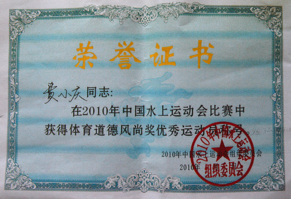 日前获悉,beat365官网黄小庆老师在2010年中国水上运动会比赛中获得体育“道德风尚奖”优秀运动员荣誉称号。