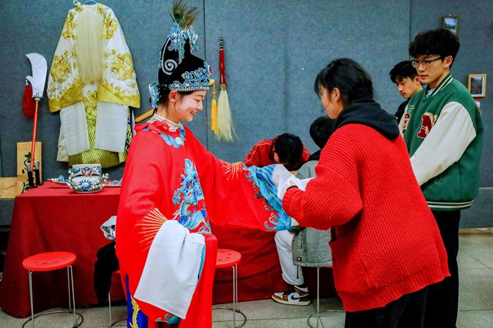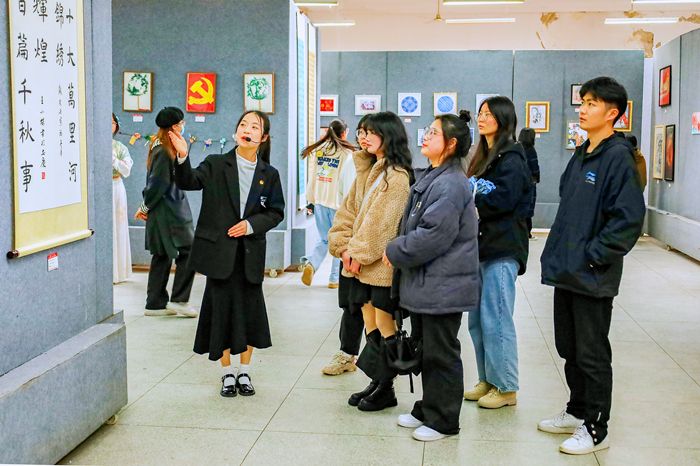 比赛结束后,参赛师生共同参加了“青春向党,艺心逐梦”公共艺术教育成果展暨主题团日活动。本次展出作品涵盖剪纸、书法、扎染、挑花、缠花等多种艺术表现形式,既反映了青春心向党、人民砥砺前行的精神风貌,又展示了安庆地域非物质文化遗产。参展师生穿梭在一件件作品间,或驻足观看,或亲手体验,细细品味着作品的精神内涵。