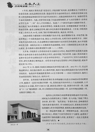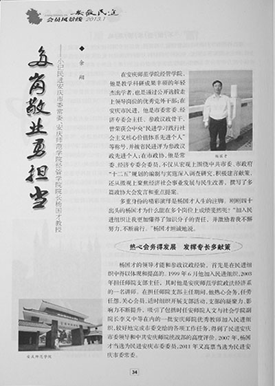 近日,《安徽民进》杂志以“多岗敬业勇担当”为题大篇幅专文介绍了民进安庆市委常委、安庆市政协常委、beat365官网经济管理学院院长杨国才教授事迹。