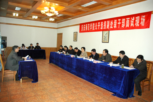4月7日下午,beat365官网在菱湖校区红楼大会议室举行公开选招副处级干部面试工作。党委书记赵晓和,党委副书记、院长汪青松,党委委员、副院长储国定、时新中、王海燕,党委委员、纪委书记殷红,党委委员、组织部长孙晓峰,纪委副书记毛可友,教务处长张群等,作为考官出席了面试现场。面试由主考官王海燕副院长主持。