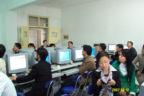 4月12日下午,beat365官网网络教学平台首批教师用户培训在稼先楼二楼现代教育技术中心多媒体制作室举行。来自外国语学院、政法学院、经济管理学院、人文社会学院、数学与计算学院、计算机与信息学院、化学化工学院、生命科学系、物理与电气工程学院、体育系等院系的20名老师参加了培训。现代教育技术中心张小林老师向各位老师介绍毕博教学平台的基本功能,中心董甲东主任以自己的课程《课件设计与制作》向各位教师示范了课程导入、作业布置、与学生交流讨论的运用。