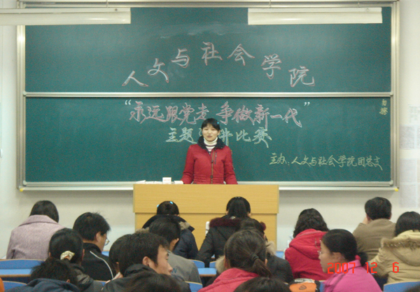 12月6日晚,人文与社会学院在文津楼102教室举行大学生学习贯彻十七大精神“永远跟党走,争做新一代”主题演讲比赛。本次比赛由人文与社会学院团总支主办,是该院大学生深入贯彻学习党的十七大精神系列活动之一。之前通过各班初选产生的28名选手踊跃登台演讲。