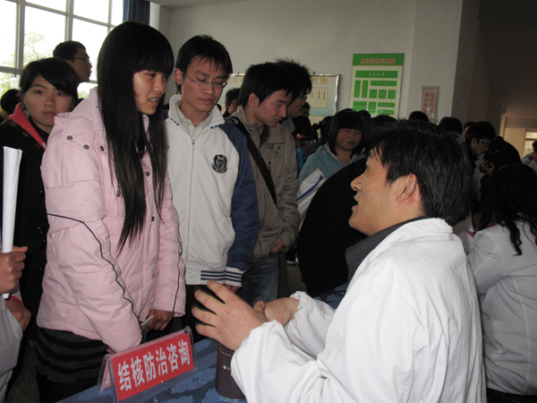 3月24日是第15个“世界结核病防治日”,校医院、团委、学生会在校医院一楼大厅开联合举办了以“遏制结核 健康和谐’为主题的健康咨询宣传活动。本次活动旨在通过宣传、咨询使同学们了解结核病的流行形势及对人群的危害,掌握结核病防治相关知识,遏止结核病的传播以及政府免费治疗肺结核病人的优惠政策,更好地动员全社会共同参与结核病防治工作活动。