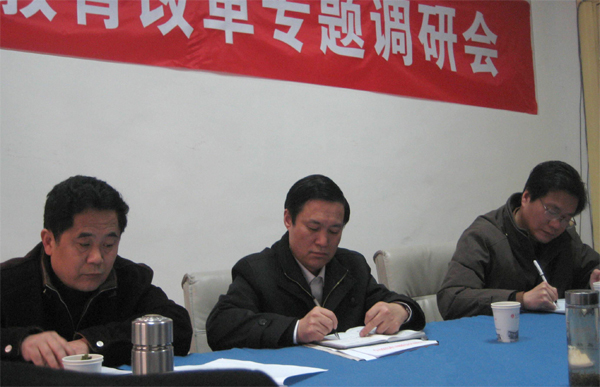 2008年1月9日下午,院长汪青松教授率领教育专业发展中心张国定、董根明教授来到教育学院,开展08版教师教育人才培养方案及教师教育改革调研。汪院长听取了教育学院黄警钟书记、曹长德院长分别就教育学院专业建设成效和新的改革方案及举措的汇报,教育学院部分专业负责人及教研室主任参加了研讨会。