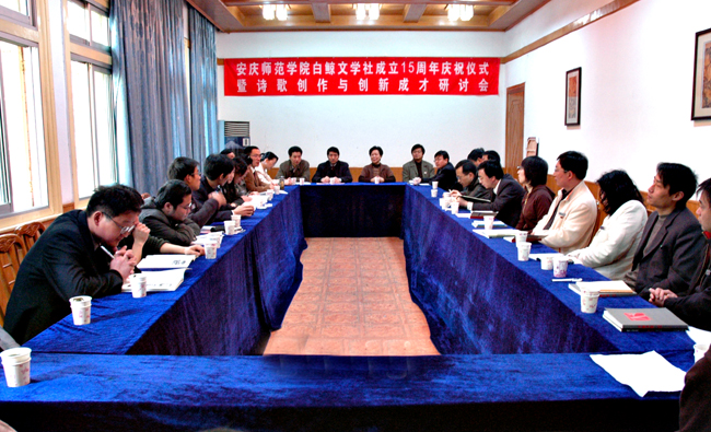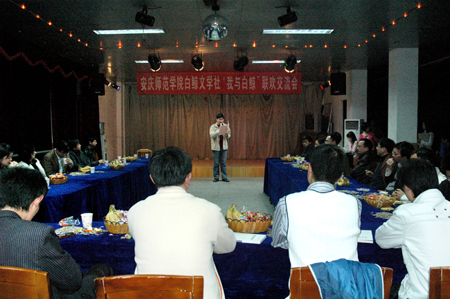 庆祝仪式结束后进行了诗歌创作与创新成才研讨,由团委副书记朱新华主持。首先,白鲸顾问沈天鸿老师、李凯霆老师发言。他们在回顾白鲸曾经辉煌时刻的同时又告诫白鲸人不可忘记白鲸历史中惨淡的时刻,并且对白鲸现在运作中存在的问题提出了许多建议。然后,白鲸之子一一发言,对白鲸的现状提出了自己的看法,并且鼓励社员们多多创作,提高竞争力,在论坛、博客的技术支持下更好的发展壮大。