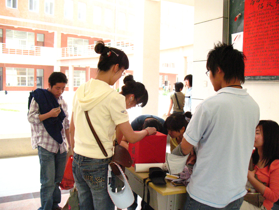 5月12日下午四川省汶川县发生7.8级强烈地震,灾害损失十分严重。灾区等待救援的幸存者将面临缺乏净水、庇护所、食物、卫生设施和药物的困境。为了帮助、支持灾区人民早日战胜灾害、重建家园,发扬“一方有难、八方支援”的中华民族优良传统,5月13日晚美术学院团总支、学生会向全体学生发起了向四川地震灾区捐款的倡议,得到各班级的积极响应。5月14日该院党总支向全院师生发出了向四川地震灾区献爱心的号召。5月15日该院工会、院学生会积极组织全院师生向灾区捐款,在美术楼专门设立了捐款箱。同学们还自发购买了白色T恤,发挥专业特长,在T恤上绘制各类爱心宣传图案,再将T恤义卖所得作为捐款汇往灾区。许多老师、同学还通过发送短信的方式向灾区捐款、传递祝福。