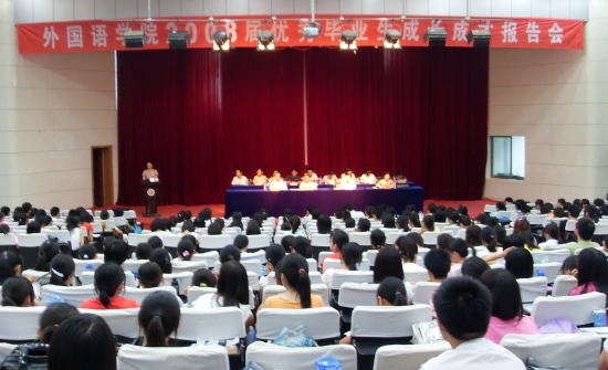 6月11日晚,外国语学院2008届优秀毕业生成长成才报告会在龙山校区学术报告厅隆重举行。外国语学院党政领导及各年级辅导员老师出席了报告会,会议由该院党总支副书记江燕琴同志主持,外国语学院共400余名同学聆听了报告。