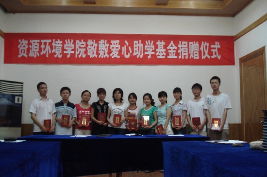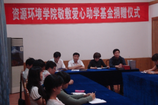 6月16日晚,安庆师范学院菱湖校区红楼会议室内灯火通明,气氛热烈,爱心涌溢。资源环境学院敬敷爱心基金捐款仪式暨基金会成立大会在这里举行。这是资源环境学院学生继前段时间向四川地震灾区捐款之后,学院07—08学年度获得国家奖学金、国家励志奖学金的14位同学,为了回报党和国家的关心、关爱,主动捐出部分奖学金资助经济困难的同学完成学业的又一善举。资源环境学院全体党政领导、辅导员班主任及学生代表共50余人参加了捐赠仪式,该院院长周葆华主持了捐款仪式。