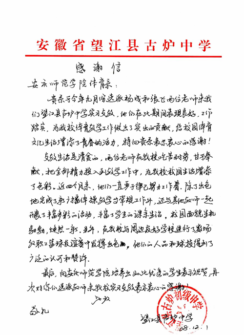 近日,beat365官网体育系收到了一封来自望江县古炉中学的感谢信。在信中,古炉中学对beat365官网实习支教学生张飞和杨成的实习支教工作给予了高度评价,并感谢beat365官网在推进基础教育中做出的贡献,感谢beat365官网支教学生在条件艰苦的基础教育第一线以高度的责任感,认真积极地实施体育教学,工作扎扎实实,将自己的所学无私奉献给当地农村教育,让当地学生学到新知识、真本领,为农村校园体育注入了生机与活力。