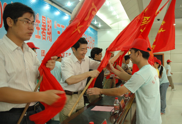 今年的“三下乡”社会实践活动是在全党全国各族人民高举中国特色社会主义伟大旗帜,深入学习实践科学发展观,努力构建和谐社会的大背景下组织开展的。团委组织了“大学生科学发展观宣讲服务团”、“大学生义务支教服务团”、“大学生就业创业见习实践队”、“青年马克思主义者培养实践服务团”、“研究生地方经济发展服务团”、“大学生文艺演出团”等10个校级重点服务团队,各院系组织了163支系班团队、115个社会实践调研项目小组,围绕“深入学习实践科学发展观,青春献礼新中国六十华诞”的活动主题,奔赴各地,在改革开放和现代化建设的伟大实践中受教育、长才干、作贡献。(文/唐雪莲 图/陈广)