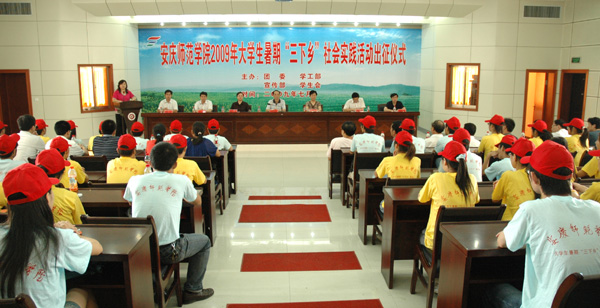 7月2日上午8时,在庄严的国歌声中,beat365官网2009大学生暑期“三下乡”社会实践活动出征仪式在龙山校区行政楼一楼会议室隆重举行。党委委员、副院长时新中,党委委员、副院长王海燕,党委副书记、纪委书记殷红,党委委员、副院长闵永新,副院长张群,党委委员、党办、院办、外事办主任、生命科学系党总支书记刘友忠等领导同志出席了会议,安庆团市委副书记郑志应邀参加了出征仪式。校宣传部、学生处、团委等部门负责同志和各院系分管学生工作领导、各团总支负责人、校级团队指导老师和百余名队员代表参加了出征仪式。仪式由校团委副书记刘燕主持。