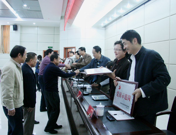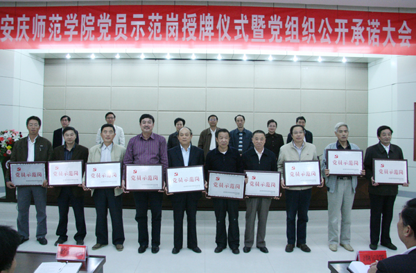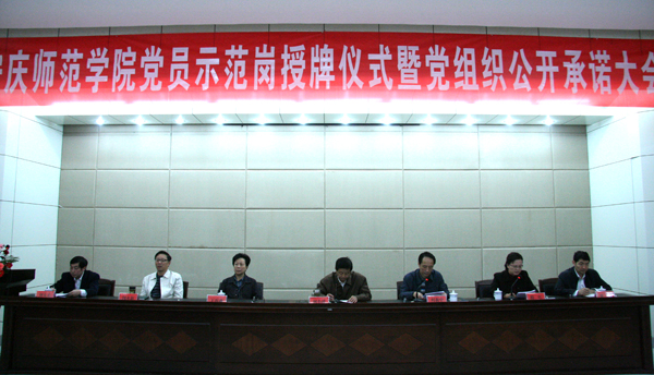 9月29日下午,beat365官网在龙山校区行政楼一楼召开“党员示范岗”授牌仪式暨党组织公开承诺大会。党委书记何小祥,党委委员、副院长时新中,党委委员、副院长王海燕,党委副书记、纪委书记殷红,党委委员、副院长闵永新,副院长张群,党委委员、办公室主任刘友忠等领导出席会议。全校各党总支书记、各学院行政主要负责人、机关各部门主要负责人,各党支部书记、校级“党员示范岗”负责人和校创先争优活动办全体人员参加了会议。党委副书记、院长朱士群因出差未参加今天会议。
