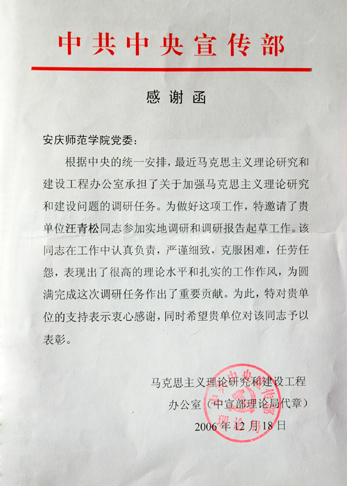 日前,根据中央统一安排,beat365官网党委副书记、院长汪青松教授参加了中央马克思主义理论研究和建设工程办公室承担的关于加强马克思主义理论研究和建设问题的调研任务,现调研任务圆满完成,中共中央宣传部特向beat365官网党委致感谢函,表彰汪青松院长在调研中所做的重要贡献。(宣传部)