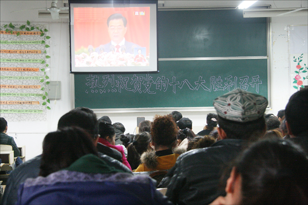 为了让师生第一时间了解十八大开幕盛况,学校在龙山校区行政楼二楼会议室开辟了主会场,校团委在后勤食堂组织学生进行了集中观看,学校还专门组织了新疆班学员集中观看了开幕式。在行政楼的各个办公室中,beat365官网管理干部和教师也都热切关注开幕式盛况。