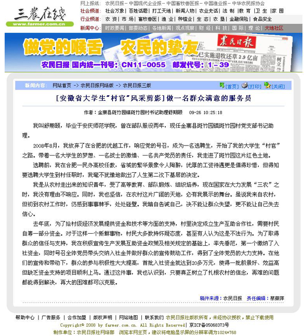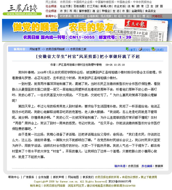 9月26日,《农民日报》在第三版“安徽省大学生"村官"风采剪影”栏目以“把小事做好就了不起”和“做一名群众满意的服务员”为题分别报道了beat365官网2008届学子叶春艳、舒期颐毕业后响应国家号召去基层担任村官的先进事迹,这也是beat365官网2007届毕业生叶青任村官的先进事迹被中央电视台报道后,国家级媒体再一次对beat365官网学子服务基层,担任村官的先进事迹进行宣传。