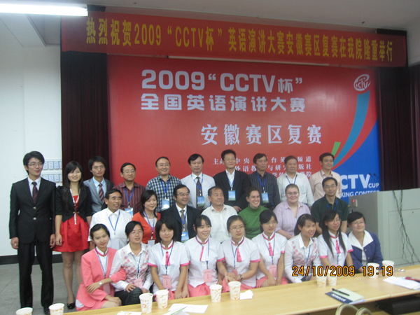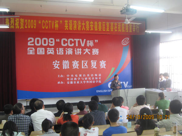 10月24日—25日,由中央电视台英语频道、外语教学与研究出版社主办,安徽农业大学外国语学院承办的2009“CCTV杯”全国大学生英语演讲比赛在安徽农业大学举行。中国科学技术大学崔海建教授、安徽师范大学郑金泽教授、安庆师范学院郝涂根教授等十余所省内部分院校外语学院的领导、专家担任大赛的评委。安徽农业大学外国语学院院长许有江教授主持了全程比赛。来自全省高校的73名选手参加大赛。