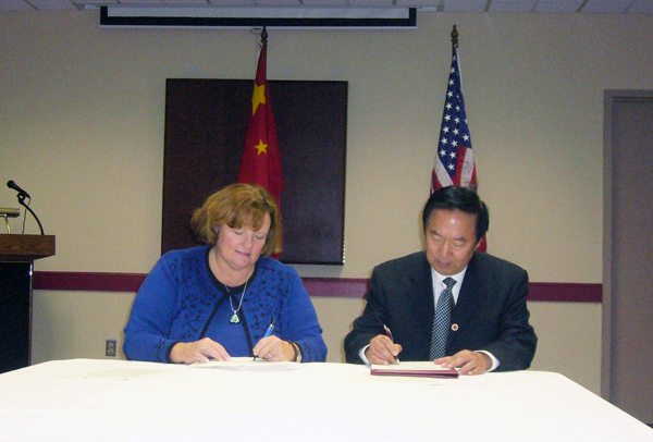 beat365官网党委书记赵晓和与索尔兹伯里大学校长詹尼特•达雷爱斯巴克女士代表双方学校签订合作协议