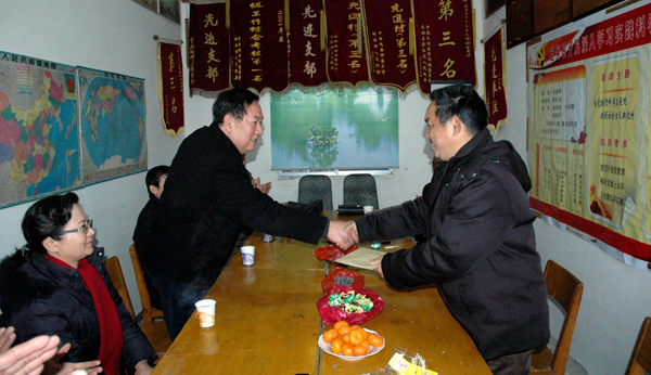 党委书记赵晓和,党委副书记、纪委书记殷红一行首先来到太湖县晋熙镇芭蕉村村部,在详细询问、了解了村里的面积、人口、基本设施建设情况、人均收入、支柱产业等基本情况后,赵书记发表了重要讲话,他认为,芭蕉村位于太湖县老城西部,合九铁路、岳华省道、太徐渠道穿村而过,交通便利,区位优越,近年来基础设施建设得到了很大改善,为加快种植业、养殖业发展,提高居民收入提供了很好的条件。他指出,按照省委组织部的要求,在第三批学习实践科学发展观活动中,挂职干部要为地方办理一件实事,因此,beat365官网党委研究决定在春节前前来慰问贫困家庭,并为芭蕉村购置一台电脑。他希望芭蕉村村委班子能用好这台电脑,多查询、发布有效的致富信息,更好地带领群众发家致富,努力建设好社会主义新农村。