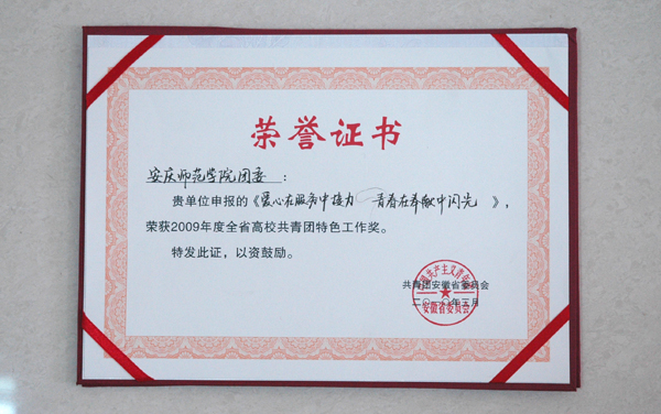 2009年,学校共青团工作在校党委的坚强领导下,在各院系、相关部门的支持下,坚持围绕中心、服务大局,以拓展学生素质、繁荣校园文化、增强团学组织活力为着力点,内强素质、外树形象,圆满地完成了年初制订的各项任务,取得了良好的工作成效。2009年,校团委完成了对500名学生骨干的马克思主义理论和实践教育,举办了青年马克思主义者培训班,开展了大学生责任教育、感恩教育和导航教育,组织了上万名学生奔赴各地开展了红红火火的暑期社会实践活动,安排了120名青年学生走进大10个村委、社区担任助理;开展了“强基层、固基础”的共青团基层组织建设工作,进一步强化基层团组织的组织建设、制度建设、活动建设,405个团支部开展了“我为祖国献青春”的主题团日活动,“举团旗、唱团歌、戴团徽”加强青年学生的团员意识教育;继续以提升学生综合素质为目的、打造学生成长成才平台,举办了12项大型活动和 68项专项活动和社团活动,学生在参加各类竞赛活动中,有222名同学获得省级以上奖项72项,其中,“挑战杯”竞赛取得历史性突破,获得全国二、三等奖,大学生艺术展演活动中,再获全国二、三等奖和全国“优秀组织奖”,beat365官网学子黄金结荣获全国首届百名“大学生志愿服务西部计划优秀志愿者”荣誉称号(安徽省仅两人获选),学前教育专业07(1)班被团中央、教育部评选为全国先进班集体(是beat365官网首个全国先进班集体)。(团委)