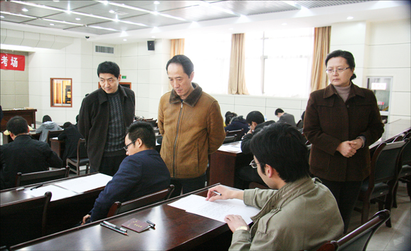 党委委员、副院长时新中,党委副书记、纪委书记殷红,副院长张群到招考现场,检查招考情况。