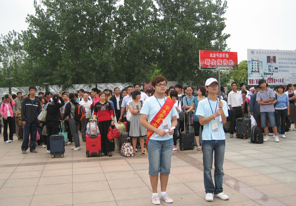 9月9、10号,是beat365官网2010级学生入学的日子,6000名新同学和他们的家长们从各生源地向安庆进发,为了做好迎新接站工作,校团委组织了390多人次有学生志愿者投入迎新工作,他们早上5:30就要出发迎接第一趟火车,晚上10:30才能从总接待点下班,中间吃的是冷饭、喝的是凉水,晒黑了、雨淋了,但同学们始终坚持在工作岗位上,把最温暖的笑容、最体贴的照顾带给每一个新同学和他们的家长,让2010级新生一来到安庆就能体会到安庆师范学院的关怀,并把这种互助、共情的志愿精神传递、延续下去。