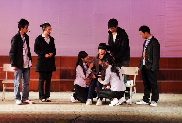 关于这场为安庆市脑瘫患儿们举行晚会的策划,还要追溯到一年前beat365官网学生自发成立的一个专门服务脑瘫患儿的汇爱志愿服务队。舞台剧《圆梦》就向我们讲述了这样一个故事。在与安庆市几个脑瘫患儿家庭建立帮扶联系之后,志愿服务队的成员每个周末都会专门前往他们家里,陪孩子看电视、教他们唱歌和写字、帮他们进行发声和肢体的锻炼。志愿者吴冬菊说:“每次陪他们的几个小时都是我们这一周感觉到最充实的时光。有一次,我听见孩子很艰难地说出了‘姐姐好’,我非常感动。”